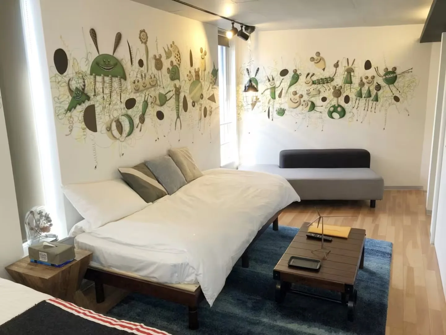 A newly constructed 5-story apartment building (completed February 2017). The exterior wall featuring OG SLICK’s mural has become a symbolic icon as a landmark of Omori-Sanno. From the entrance to all guest rooms, artwork is featured throughout, allowing you to enjoy Japan’s most cutting-edge urban contemporary art (street art, graffiti art, aerosol art) spaces.